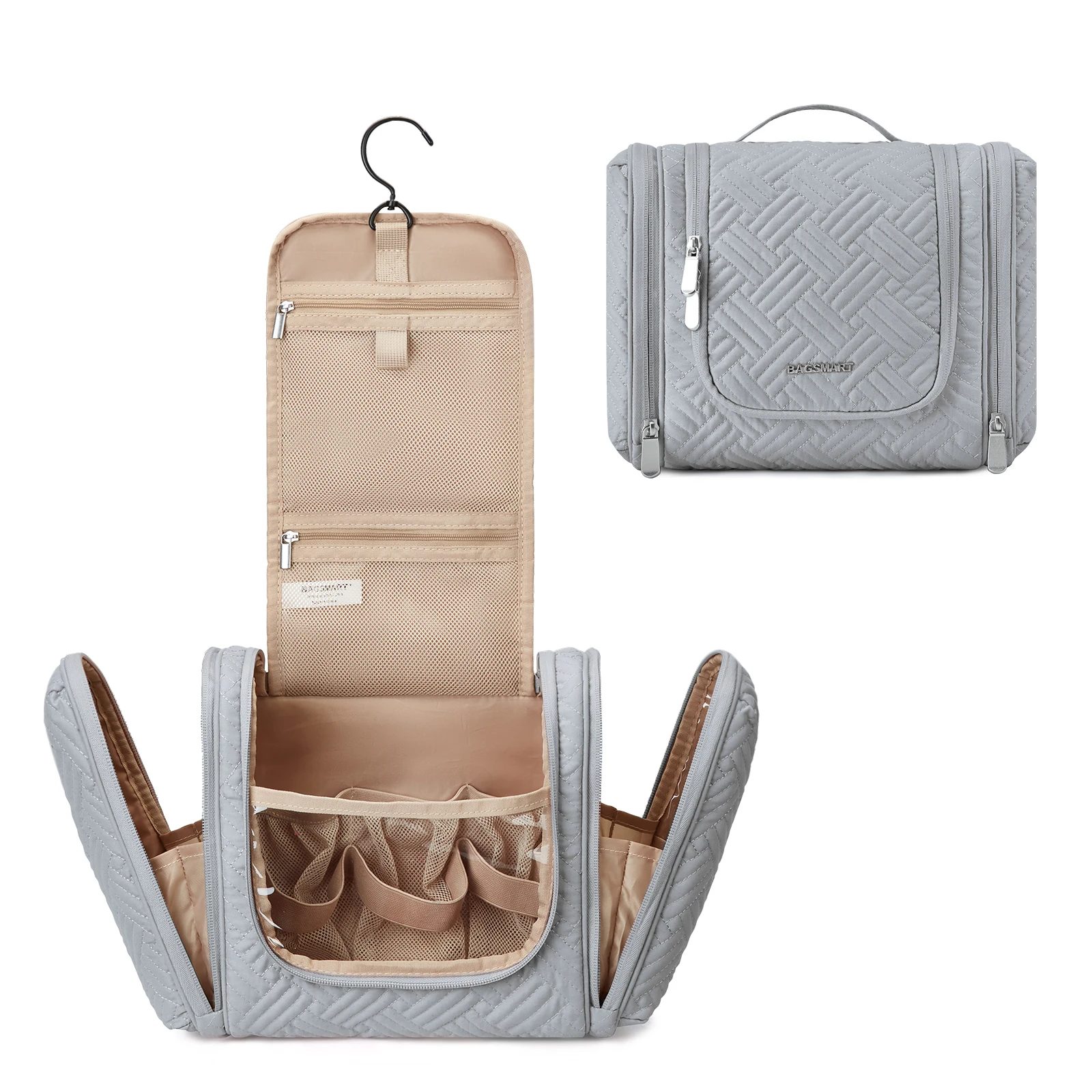 - Keep Everything Organized- Inner pockets with elastic straps hold bottles upright. Two side pockets of this travel toiletry bag can keep the wet and dry items separated. The right side pocket with PVC material is easy to clean and dry, perfect for makeup brushes, toothbrushes, and wet towels. The stow-away 360-degree swivel non-slip metal hook allows for versatile hanging options.